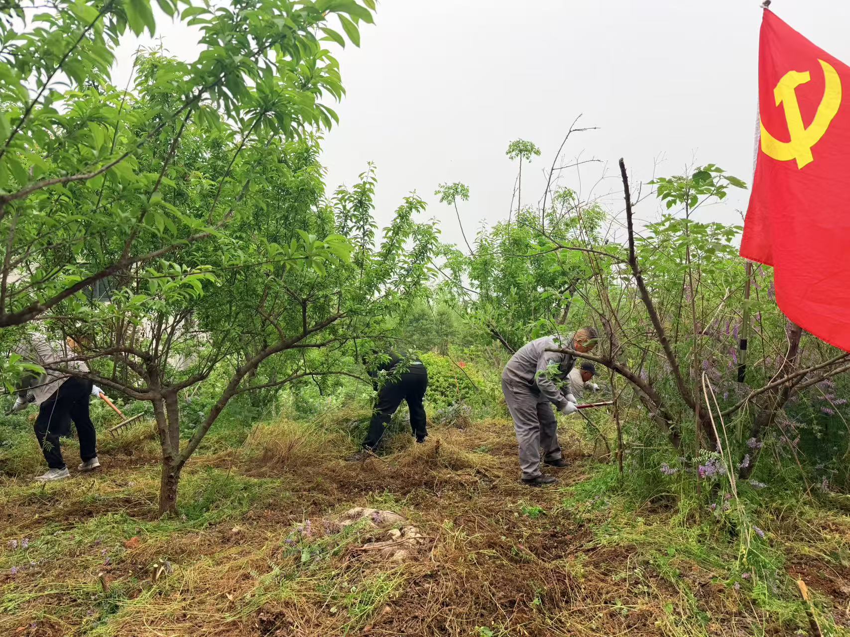 活動現(xiàn)場,黨旗飄揚,熱情高漲。黨員們沖鋒在前,帶領(lǐng)職工分組包片,展開拉網(wǎng)式清理。大家手持鐮刀、鐵鍬,俯身勞作,清除果樹下的雜草,既消除了消防安全隱患,又為果樹生長騰出了充足的養(yǎng)分空間。這片由職工親手栽種的樹林長勢喜人,成為“綠水青山就是金山銀山”理念的鮮活注腳。